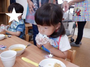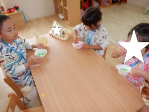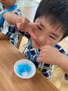 お祭りと言えば、かき氷ですね🎵「いちご・メロン・ブルーハワイ」から好きな物を選んで食べていましたよ🥰