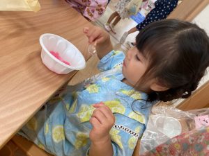 おはしでくるくる・・・ちゃんと染まるかな?跳ねないように回すのがなかなか難しいんです💦💦