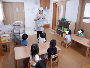 みのり組さんのクッキングはおにぎり作りです🎵「おにぎり、おーにぎり、なかみはな~にかな?」の手遊びが大好きな子どもたち😊とってもワクワクしている様子です✨