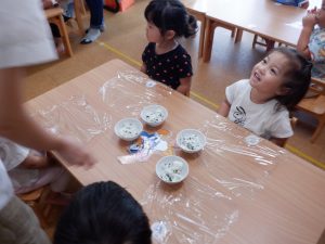 きれいな泡がいっぱいで、「ビール!」「ケーキ!」と先生たちにたくさん作ってくれました😆