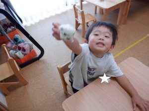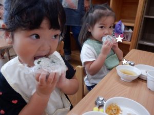 ラップをねじってギュッギュッ!がとっても上手なみのりぐみさんでした🎵三角になったり、丸くなったり、おせんべいみたいになったりと個性あふれるおにぎりができました🤩