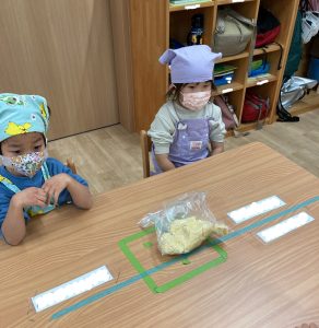 今日は他のクラスのおやつもかける組さんが作るので、みんな一生懸命型抜きに集中していましたよ💖