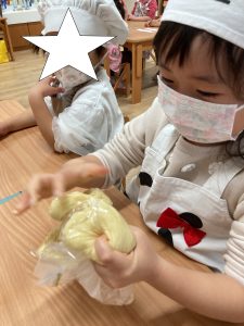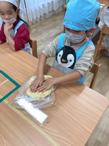 まずは袋の上からみんなで順番にこねこね・・・だんだん生地がツルツルしてきたね!