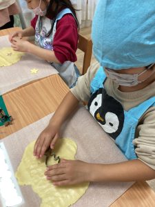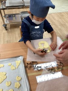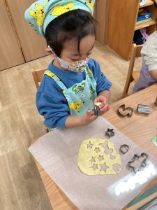 型を抜いて、また生地を丸めて、麺棒で伸ばして・・・を繰り返し、たくさんのクッキーを作ってくれました🥰「おうちでもやりたい!」と言っている子もいたので、良かったらおうちでも作ってみてくださいね♪