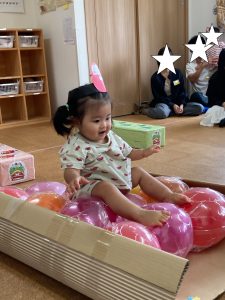 風船いかだに乗って、だるまさんが動きます✨かわいいですね🥰