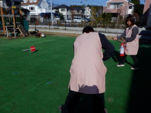万が一の時には、周囲への延焼を防ぐ為にも初期消火がとても大事になってきます♪先生たちが訓練する様子を子どもたちにも見てもらいました。