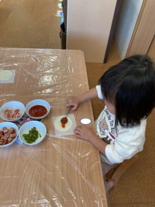 今日は餃子の皮でピザ作り♪「ねこピッツァ」の絵本を読んで、作りたい気持ちが高まってきました🥰